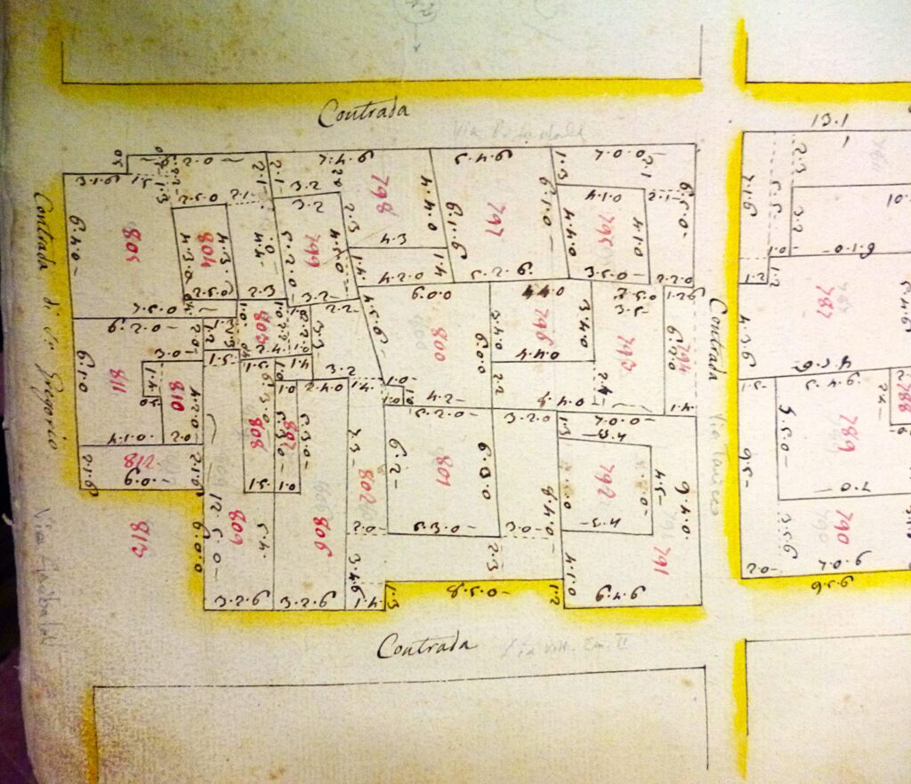Palazzo Mentone nel catasto del Maffei della fine del Settecento. L’edificio è indicato con il numero 791, mentre il cortile con il 792.