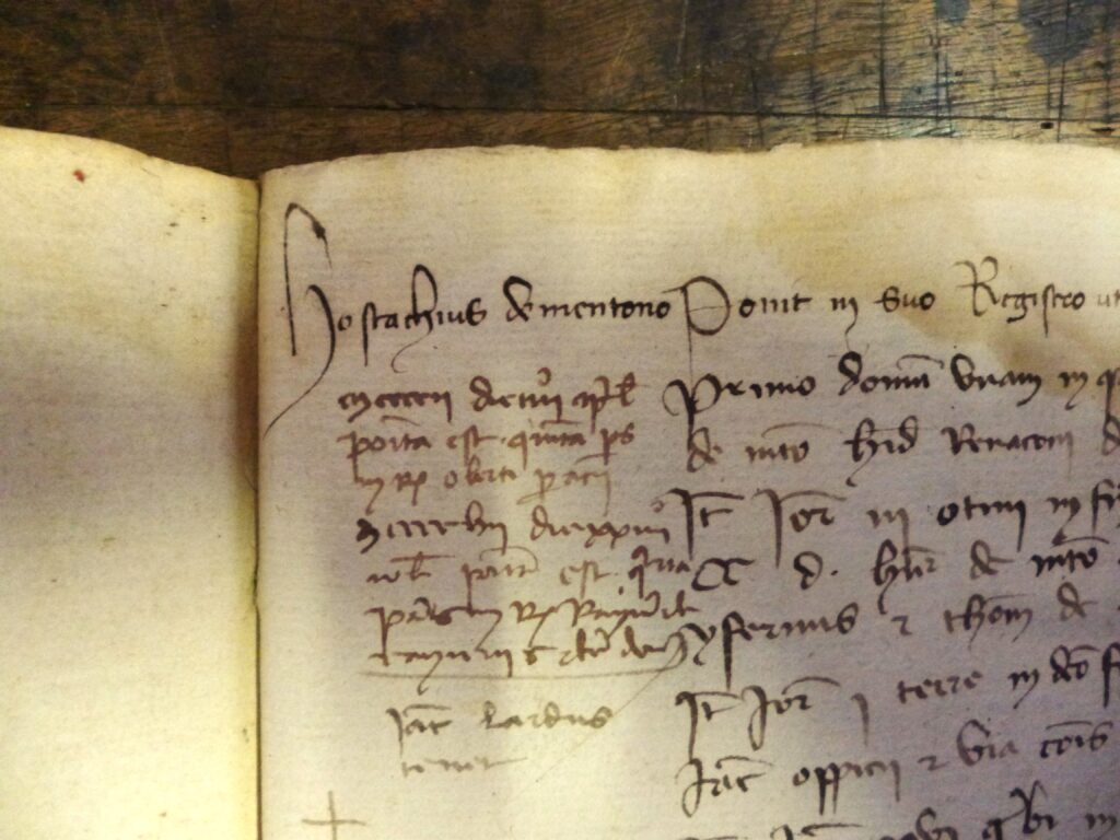 Un particolare del catasto di Cherasco del quartiere di Sant’Iffredo del 1395 con la consegna dei beni immobili di Hostachius de Mentono.